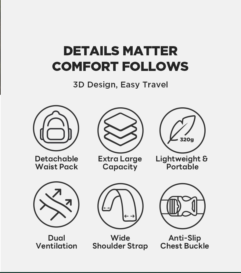 - Διαθέτει αποσπώμενη τσάντα μέσης, φαρδύ λουρί ώμου, ιμάντα στήθους με αντιολισθητική πόρπη.