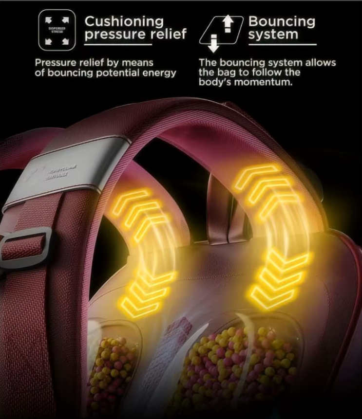 Ενσωματώνει επίσης στο πίσω μέρος 6 συστήματα 12.000 συνολικών εξαιρετικών ελαφριών σφαιριδίων απορρόφησης κραδασμών. Αυτή η σύγχρονη τεχνολογία ξεκουράζει την σπονδυλική στήλη 3 φορές παραπάνω από τα κοινά σακίδια της αγοράς.