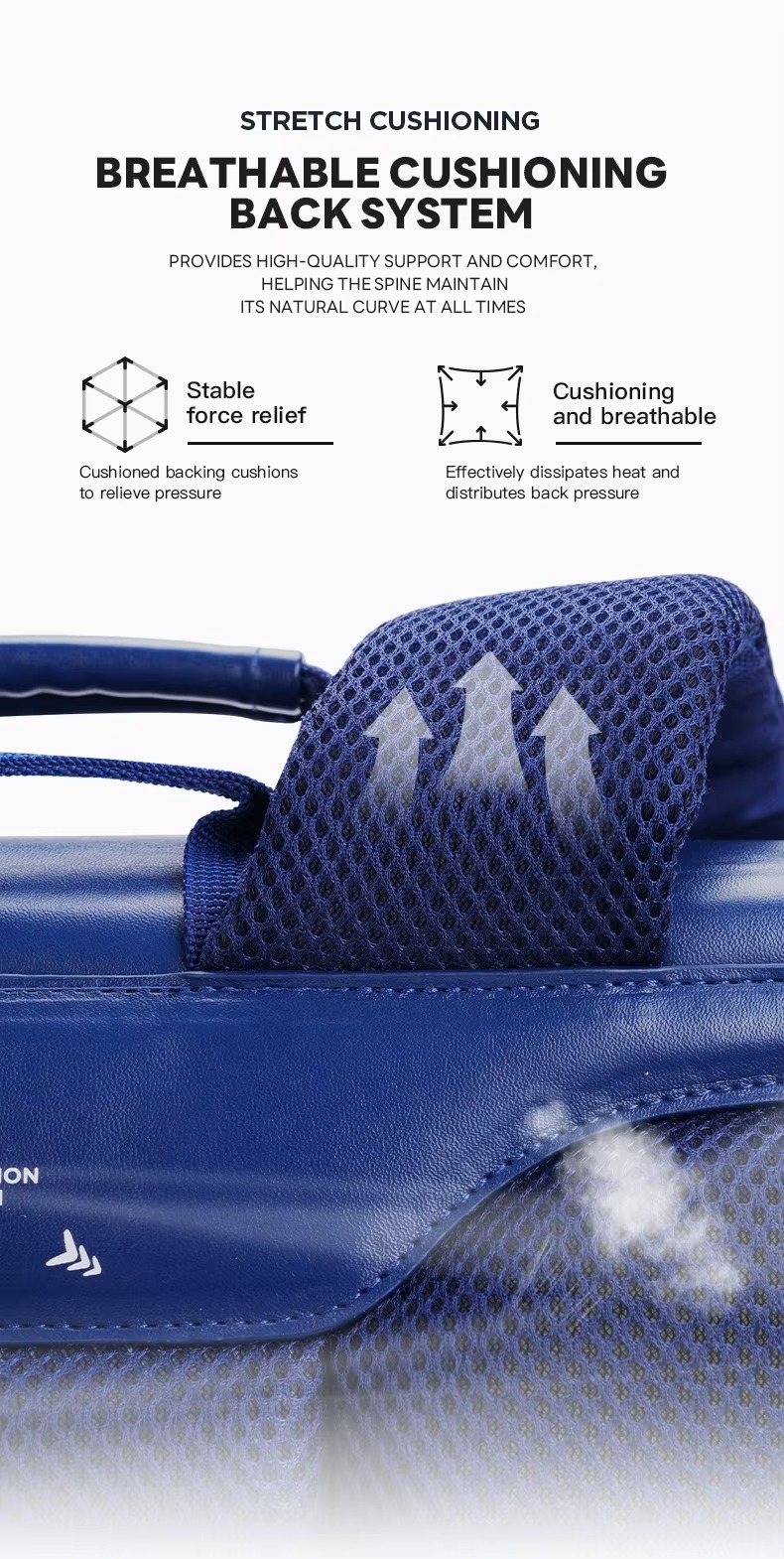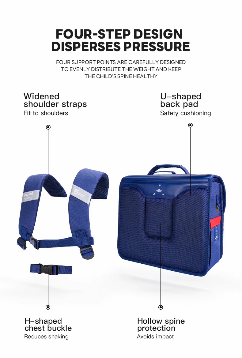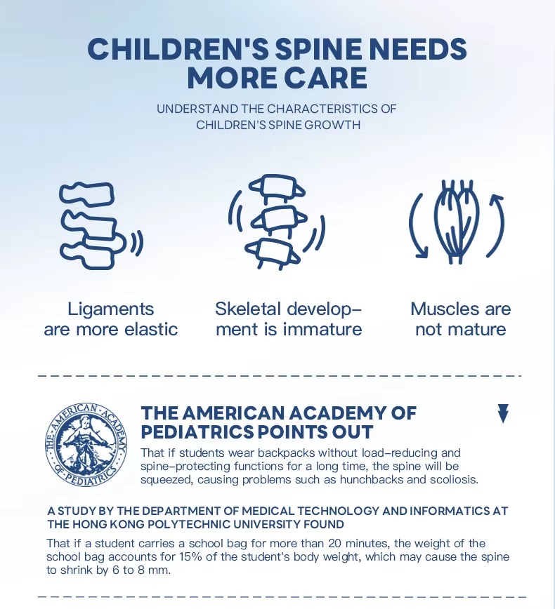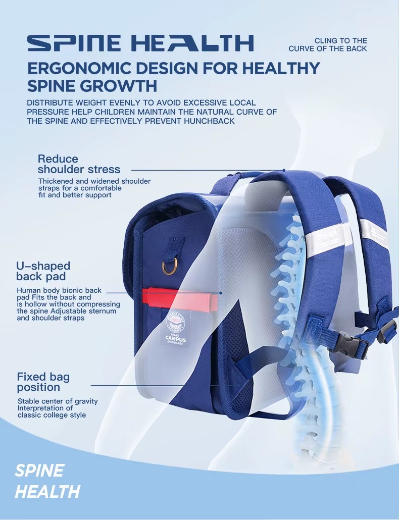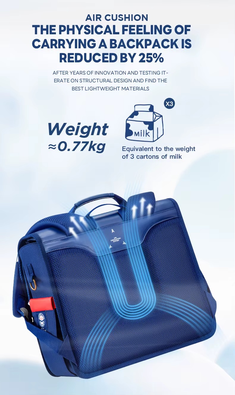 Ενσωματώνει επίσης στο πίσω μέρος συστημα σχήματος U εξαιρετικών πυκνών δικτυωτών βαθμίδων απορρόφησης κραδασμών. Αυτή η σύγχρονη τεχνολογία ξεκουράζει την σπονδυλική στήλη 3 φορές παραπάνω από τα κοινά σακίδια της αγοράς και αποφεύγεται η συρρίκνωση της σπονδυλικής στήλης του παιδιού κατά 6 με 8 mm.